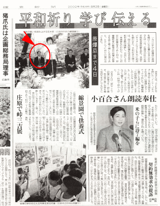 8月1日(木)縮景園原爆投棄生存慰霊供養式並びに、平和を願う集い。8月6日にも平和記念式典に参列しました。右は8月2日(金)の読売新聞に当日のことが取り上げられました。 |