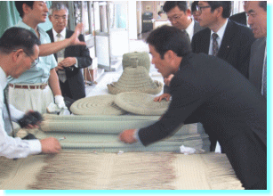 8月8日(木)〜9日(金)県内視察の写真です。左は、神石郡豊松村のアグリパーク「陽光(ひかり)の里」3億円のトマト産地を目指しています。右の写真は、福山市松永町の畳表検査場(轄ヨ藤商店)です。中国製品での厳しい競争の中、高品質で勝負しています。 |